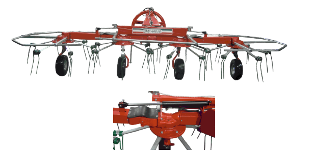 The 4 and 6 rotors versions allow to work in big grounds and allow to decrease the times of work. It is available in differents models to meet all the requirements of the customer. The hay tedders GVF with 4 and 6 rotors have hydraulical closure and,in 4 rotors version, the external rotors are lockable internally to reduce the size during the transport. The models with 4 rotors are available with fix 3rd point and swivel wheels or with articulated 3rd point and fix wheels; The model with 6 rotors is with the articulated 3rd point.
