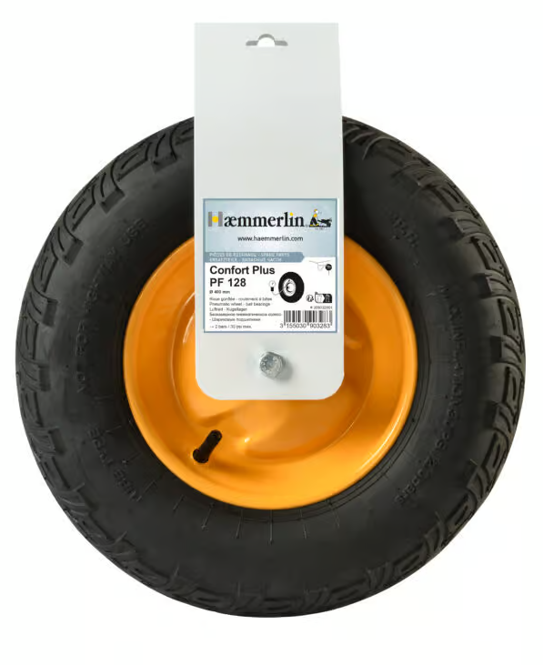 The PF 128 pneumatic wheel is designed to provide a smooth and fluid rolling experience. It is equipped with a ball bearing that reduces pushing effort and improves the stability of the wheelbarrow, even when loaded.